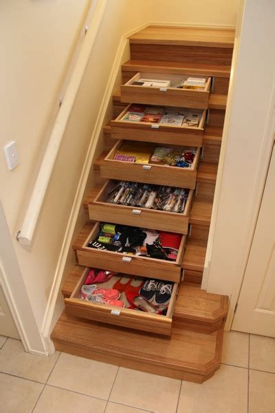DIY Staircase drawers – In-step drawers turn wasted space into a storage place Staircase drawers – Canadian Home Workshop 40 Awesomely Clever Ways To Organize Shoes trapladen: how to Staircase drawers DIY – Would also add a hinged top for each drawer. Possibly some kind of lock/stopper so the drawers wouldn't cause a crazy accident. Read more…